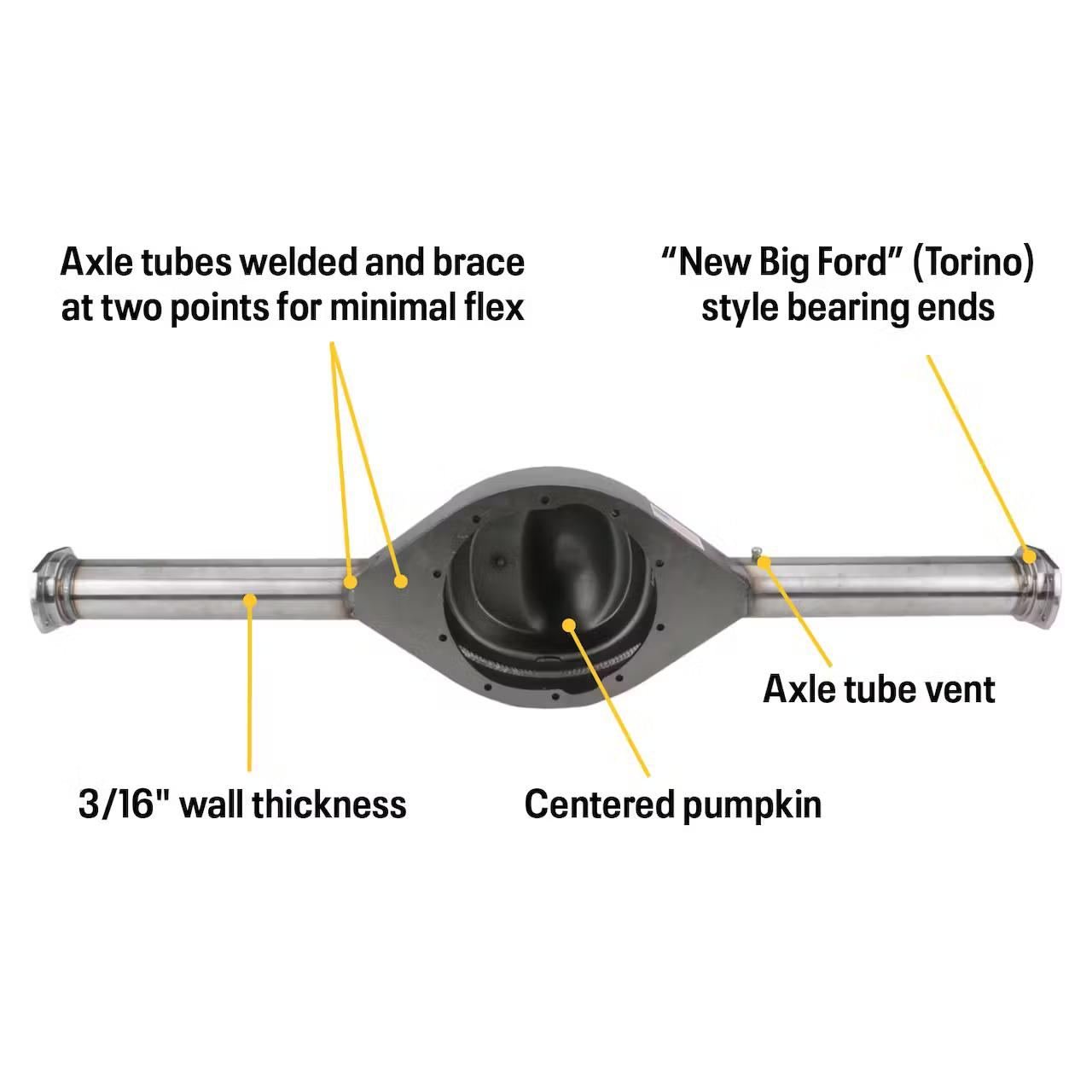 Axle tubes are 3” O.D. with a 3/16” wall thickness. Heavy-wall tubes, along with a larger center section, significantly reduce distortion during welding of rear-link brackets or spring pads. Billet steel “New Big Ford” (Torino) style bearing ends are fixture-welded (3.150” O.D. bearing, with 2.50” axle flange offset).
