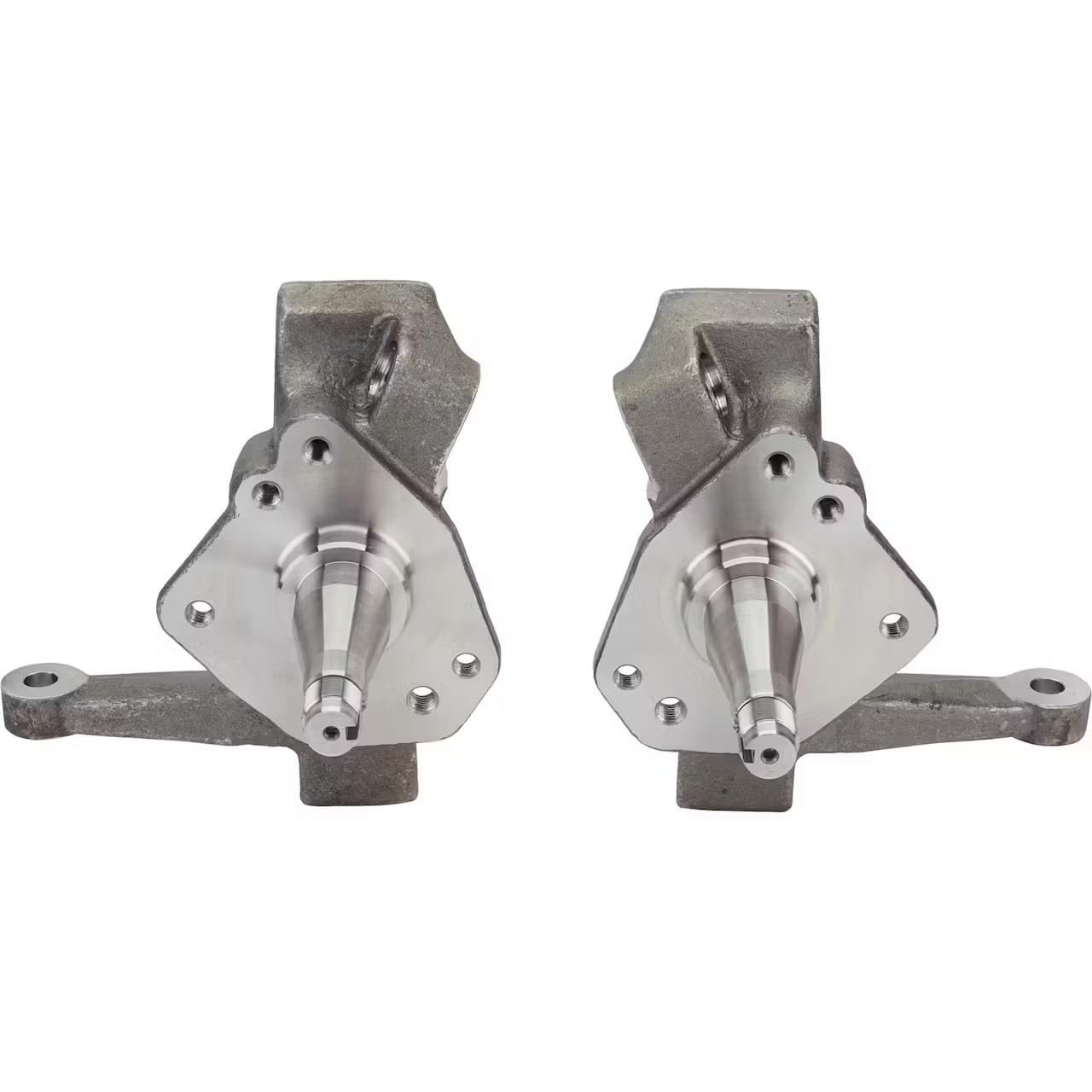 Our Mustang II spindles are constructed from 1045 heat-treated alloy steel. Retains absolute stock factory geometry and uses all stock rotors, bearings, calipers, etc., making it easy to install.