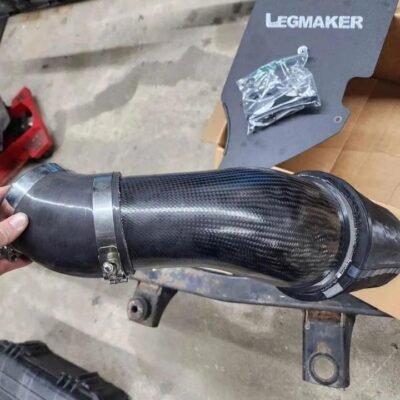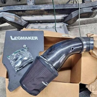 Modern Muscle Xtreme is excited to carry the Legmaker Cold Air Intake for trackhawk. This intake is carbon fiber construction with their unique fabrication process resulting in smooth inner surface to ensure smooth air flow. The pipe design is 4” diameter carbon fiber tube with a 45 degree bend to allow for the placement of the intake of the filter near the opening in the fender well. The intake comes with hi temp rubber coupler and high quality T bolt band clamp. The cold air intake system will fit both the stock and the ported throttle body. You have two color options for the oil based filter red or blue. This intake has a pre-drill for intake air temperature sensor. This Legmaker kit comes with all of the necessary hardware and instruction for your DIY installation.